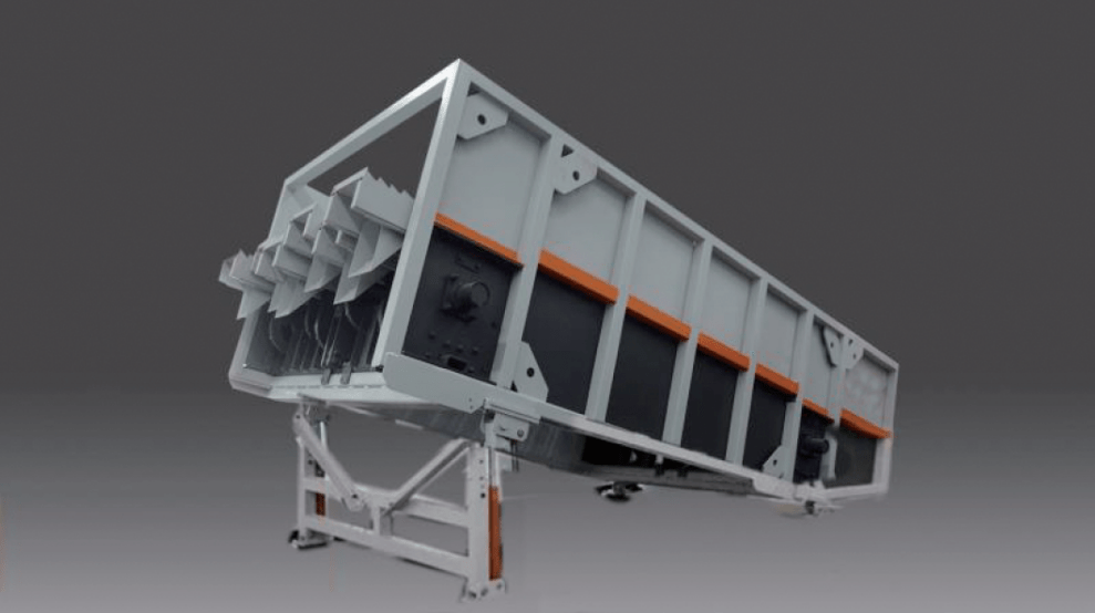 彈跳分選篩在驅(qū)動電機的作用下,通過主動軸、被動軸、偏心輪(曲軸、鏈條等傳動裝置)組成的主被動傳動機構(gòu)與支撐座和篩板連接形成平行四桿機構(gòu),篩板產(chǎn)生類似于彈跳的往復(fù)圓周運動,將從進料口輸入的物料分離為三種,粒徑大反跳效果好的、沉重的、能滾動的3D物料,粒徑小、反彈效果差的篩下物料,粒徑大反彈效果差的、扁平的、輕質(zhì)的2D物料,分別被三個出料斗接收。