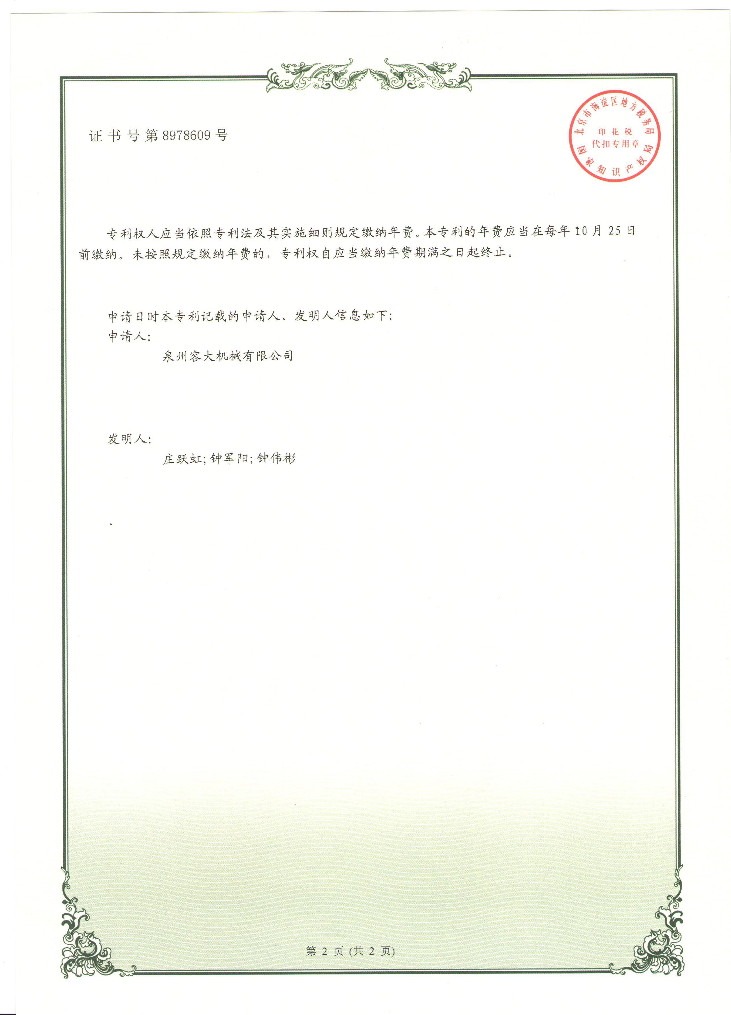 您的位置: 泉州容大機(jī)械有限公司 > 專利證書 > 多功能修整機(jī)